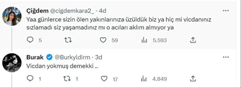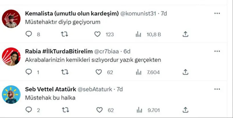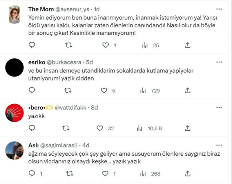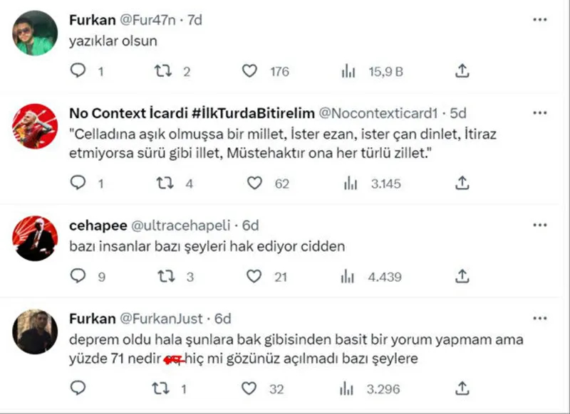 Deprem felaketinin yaşandığı illerde AK Parti ve Cumhurbaşkanı Recep Tayyip Erdoğan'a büyük destek geldi. Seçim sonuçlarını hazmedemeyen Kılıçdaroğlu destekçisi bazı vatandaşlar sosyal medyada depremzedeleri insanlık dışı sözlerle hedef aldı. Seçim sonuçlarının gelmeye başlamasının ardından depremzedelere hakaretler yağdırdılar. "Keşke daha çok ölseydiniz" ifadelerini kullandı.