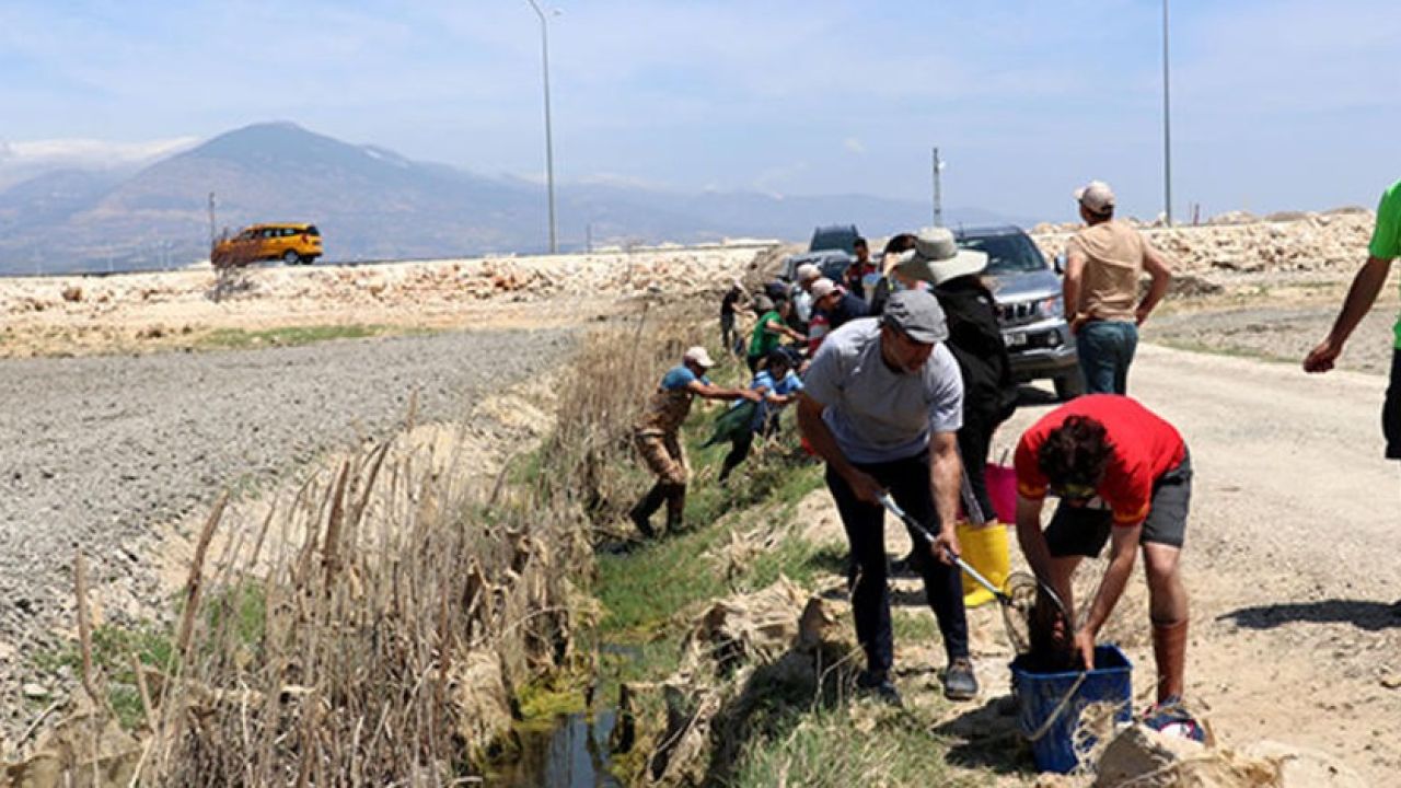 Ovada bir araya gelen yaklaşık 120 doğasever, ellerinde file ve kovalarla küçük su birikintilerindeki balıkları yakalayarak kamyonet kasasında brandayla oluşturdukları havuza doldurdu.