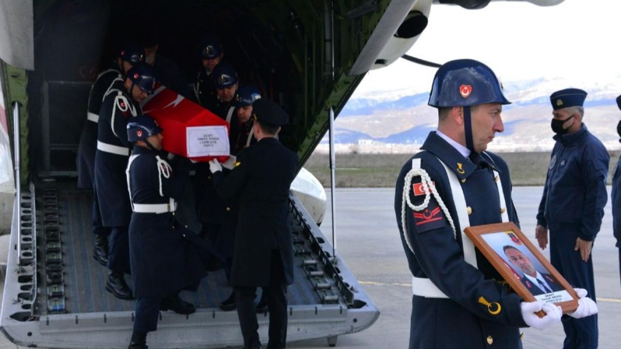 Askeri uçakla Bingöl Havalimanı'na getirilen şehidin Türk bayrağına sarılı tabutu, askerler tarafından cenaze aracına alındı.