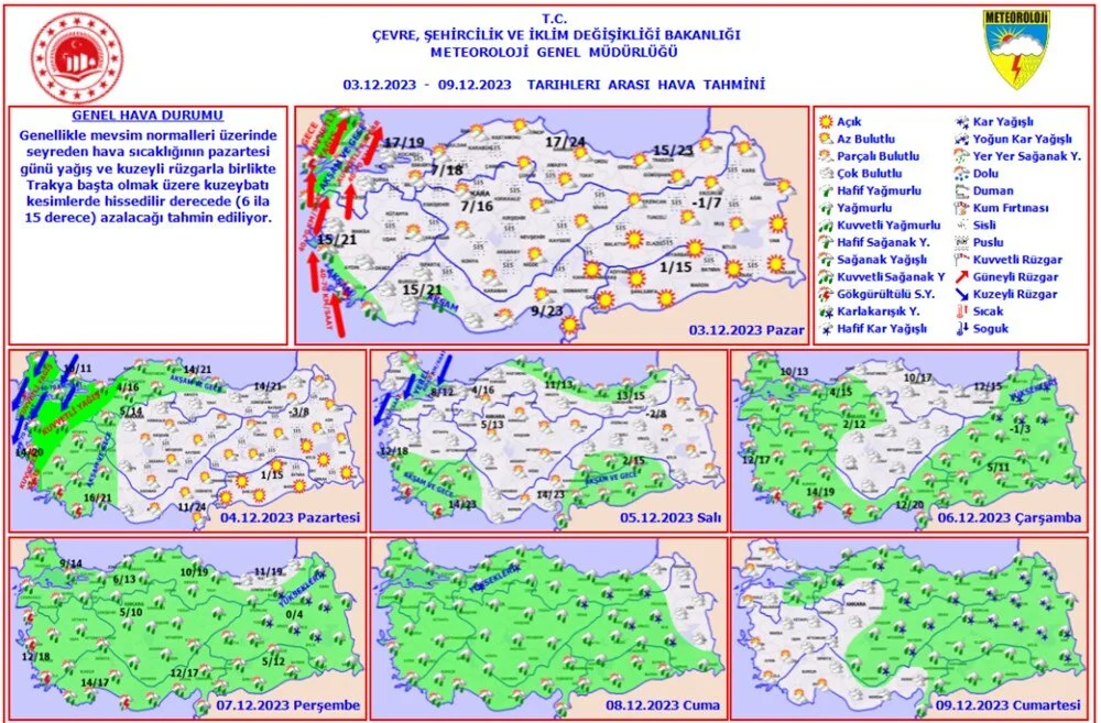 Parçalı ve çok bulutlu, Trakya Kesimi ile İstanbul ve Çanakkale çevrelerinin sağanak ve gök gürültülü sağanak yağışlı geçeceği tahmin ediliyor. Yağışların Trakya kesimi ile Çanakkale çevrelerinde yer yer kuvvetli olması bekleniyor. Rüzgarın; batı kesimlerinde güney, yarın (Pazartesi) kuzey yönlerden kuvvetli (40-70 km/saat) olarak eseceği tahmin ediliyor. Sabah ve gece saatlerinde doğusunda yer yer sis ve pus hadisesi görülmesi bekleniyor.