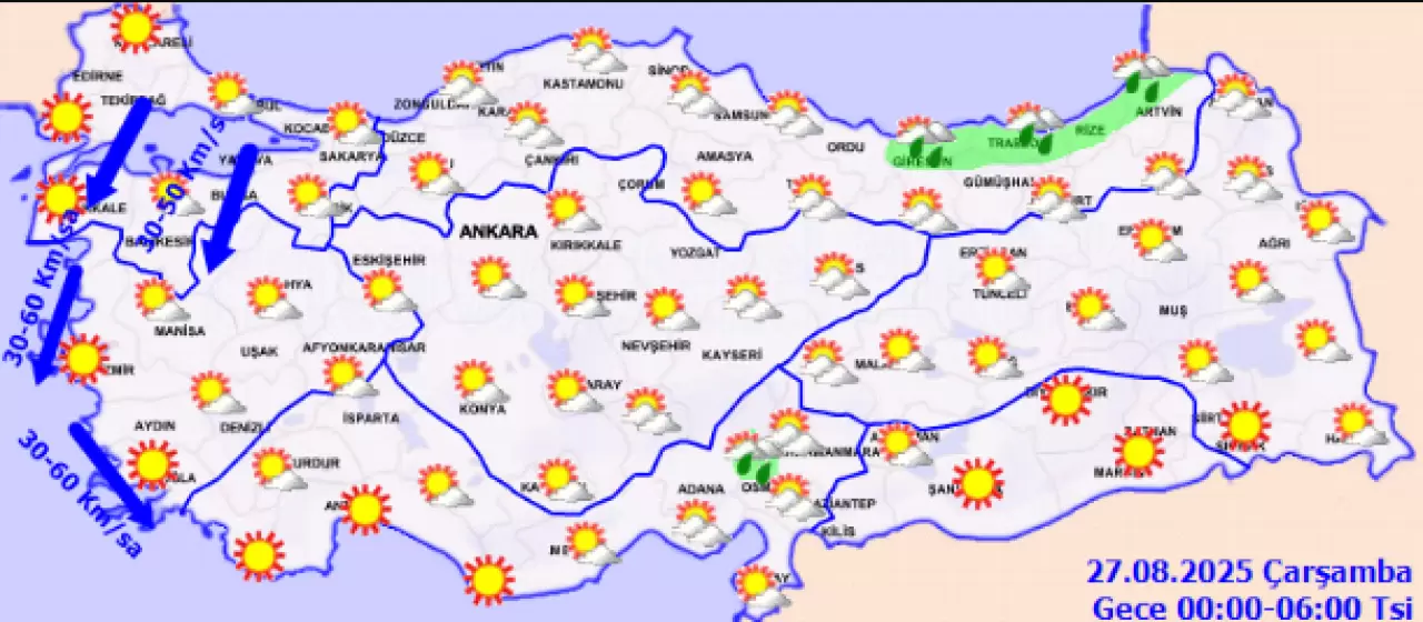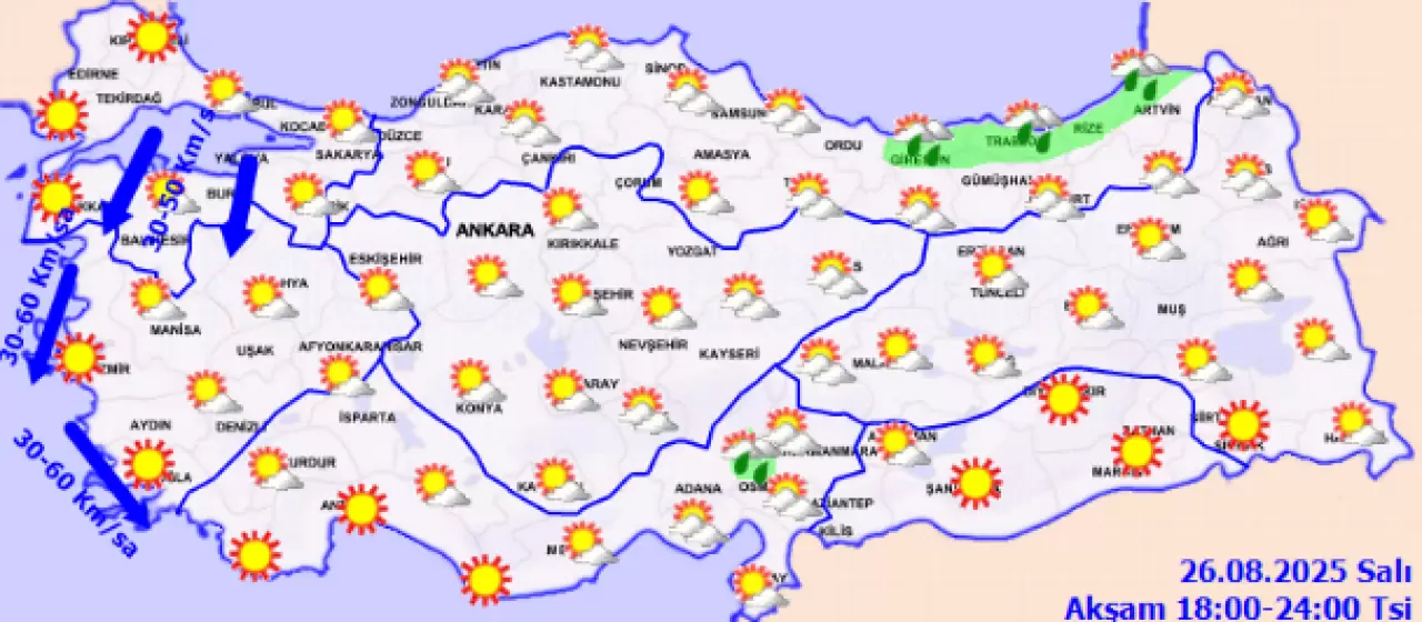 Az bulutlu ve açık geçeceği tahmin ediliyor. Rüzgârın, kıyı kesimlerinde kuzeyli yönlerden kuvvetli (30-60 km/saat) esmesi bekleniyor.