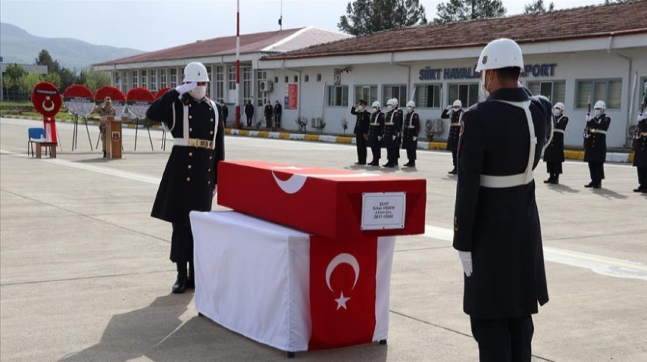 Siirt Havalimanı'nda düzenlenen törende, terör örgütü PKK'ya yönelik operasyonda şehit olan Jandarma Uzman Çavuş Erkan Erdem'in (28) Türk bayrağına sarılı tabutu, katafalka konuldu.