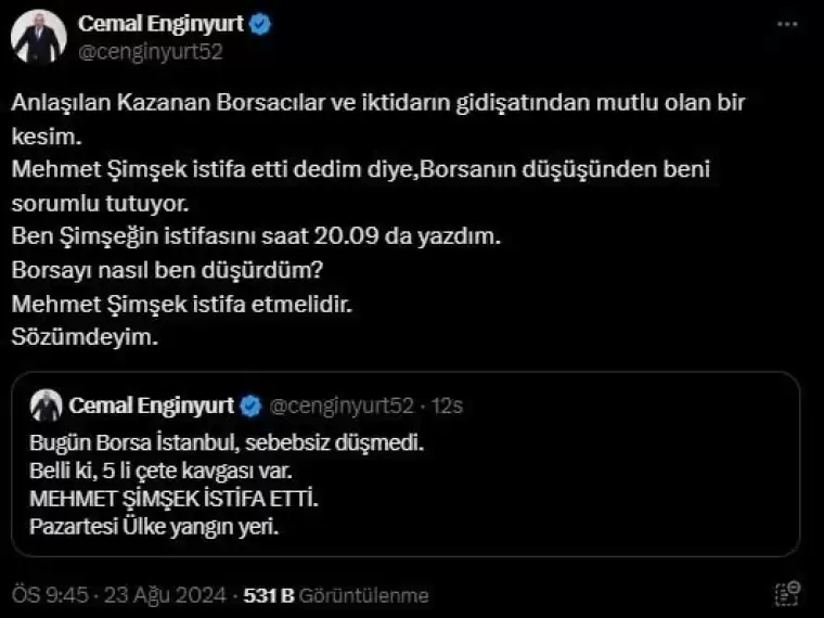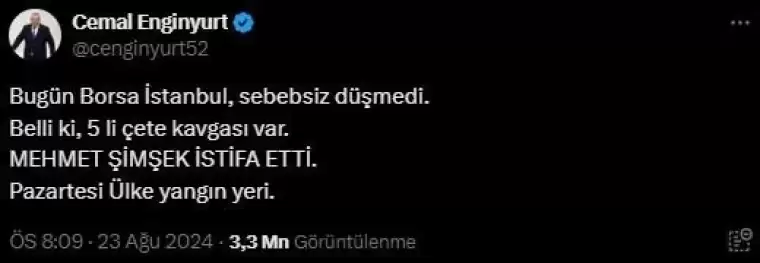 Öte yandan tartışmaların ardından bir kez daha paylaşım yapan Enginyurt ise, "Anlaşılan kazanan borsacılar ve iktidarın gidişatından mutlu olan bir kesim Mehmet Şimşek istifa etti dedim diye, borsanın düşüşünden beni sorumlu tutuyor. Ben Şimşeğin istifasını saat 20.09 da yazdım. Borsayı nasıl ben düşürdüm? Mehmet Şimşek istifa etmelidir. Sözümdeyim." açıklamasını yaptı.