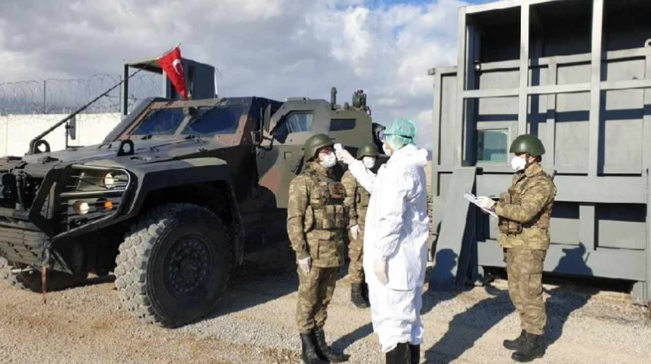 Fotoğraflarda, askerlerin koruyucu tulumla görev yaptığı, araçların dezenfekte edildiği, ateş ölçümü yapıldığı görülüyor.