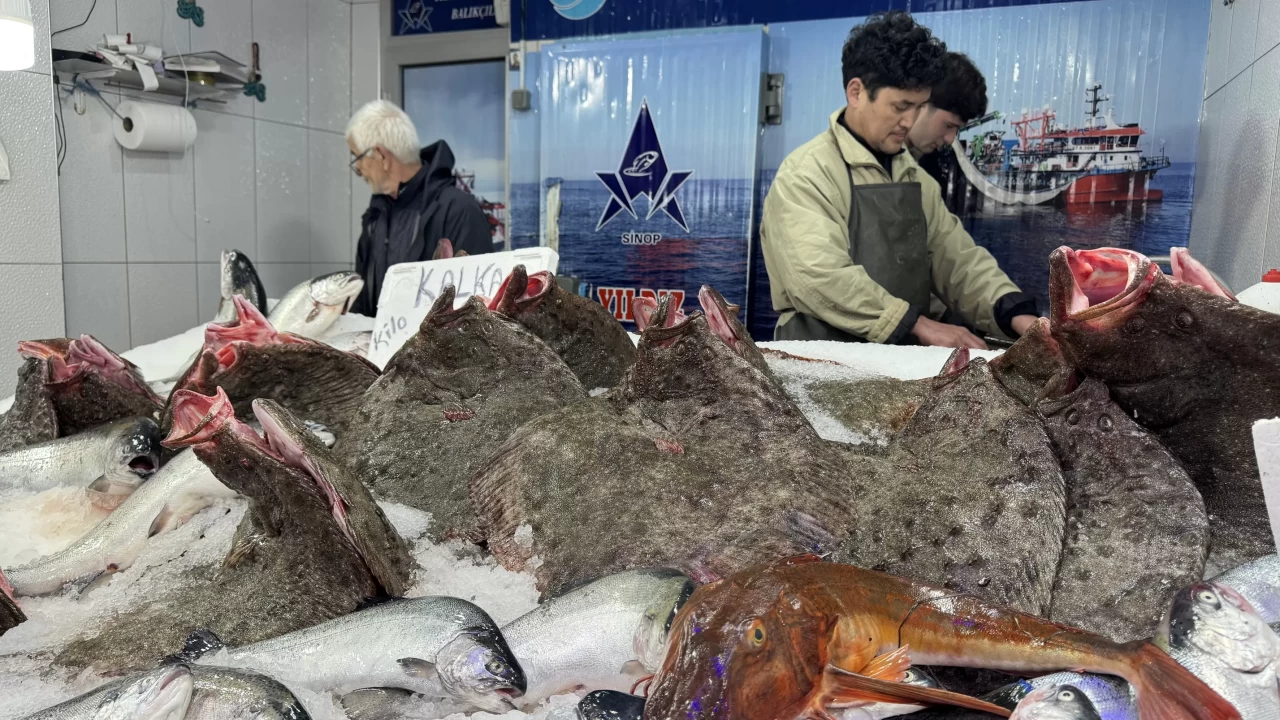 Kentte denize açılan balıkçıların ağlarına takılan kalkan balıkları tezgahları süslüyor.