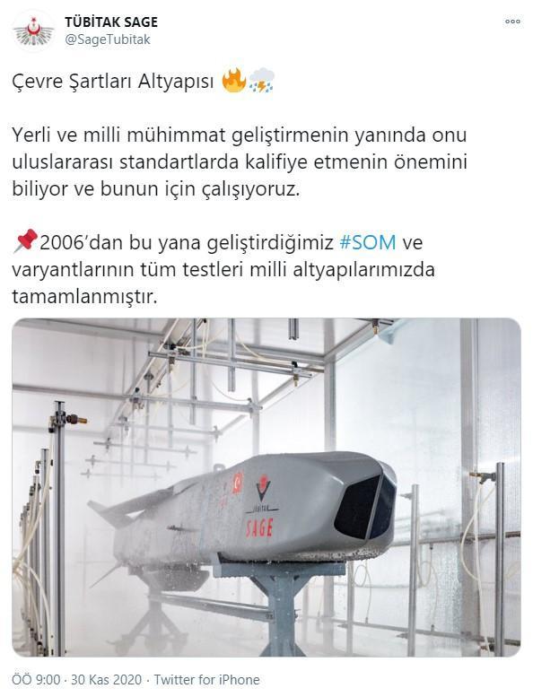 TÜBİTAK SAGE sosyal medyadan yaptığı paylaşımda, "Yerli ve milli mühimmat geliştirmenin yanında onu uluslararası standartlarda kalifiye etmenin önemini biliyor ve bunun için çalışıyoruz. 2006’dan bu yana geliştirdiğimiz SOM ve varyantlarının tüm testleri milli altyapılarımızda tamamlanmıştır." açıklamasında bulundu.