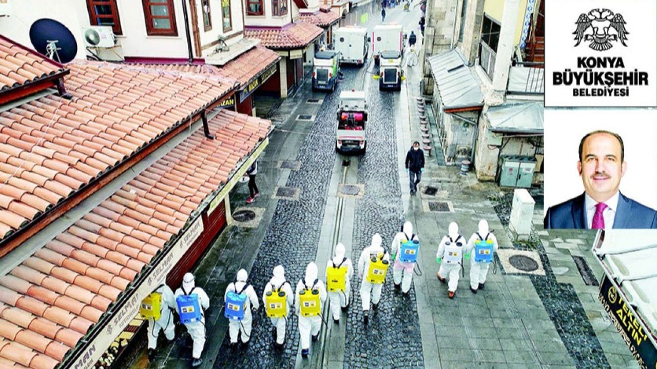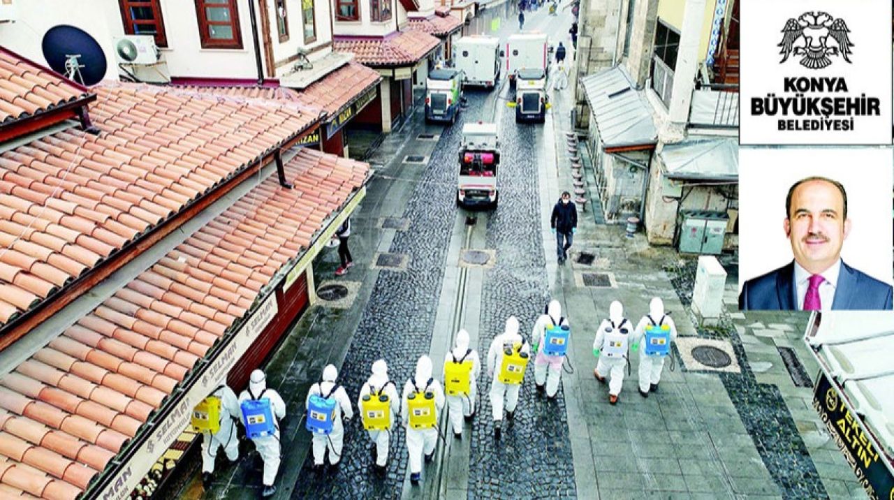 Konya Büyükşehir Belediyesi, koronavirüs salgınının Türkiye’de görülmeye başladığı ilk günden itibaren vatandaşların sağlığı için çalışmalarına aralıksız devam ediyor. Konya Büyükşehir Belediyesi, Dezenfeksiyon Eylem Planı kapsamında merkez ve 28 ilçede belediye hizmet binaları, kamu kurum ve kuruluşlarına ait binalar, kültür merkezleri, İl Milli Eğitim Müdürlüğüne bağlı okullar, üniversiteler, havaalanı, otogarlar, askeri binalar, camiler, eczaneler, umuma açık tuvaletler, meydanlar, alt ve üstgeçitler, yatılı Kur’an kursları, öğrenci yurtları, dernek binaları ve müzelerin dezenfeksiyonunu yaptı. Büyükşehir, 28 ilçe merkezindeki camiler, okullar ve resmi kurumların tamamı ile şehir merkezindeki tüm camilerin dezenfeksiyonunu tamamladı. Konya Büyükşehir Belediyesi, otobüs ve tramvaylardaki dezenfeksiyon çalışmalarını da düzenli olarak sürdürüyor. Toplu ulaşım araçlarını kullanmak zorunda olan insanların sağlığı için büyük titizlikle çalışan Büyükşehir, toplu ulaşım araçları ve şehir merkezinde bilgilendirme broşürleri de dağıtıyor. Konya Büyükşehir Belediyesi, Dezenfeksiyon Eylem Planı kapsamında belediyeye ait toplu ulaşım araçlarının yanı sıra resmi kurumların hizmet araçları ile hatlı minibüsler, ticari taksiler ve personel servislerinin de ücretsiz dezenfeksiyonunu yapıyor.