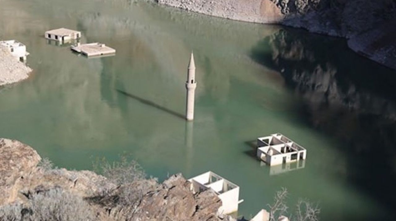 Barajda su seviyesinin son günlerde düşmesi üzerine Artvin-Yusufeli kara yolu üzerindeki Narlık köyünün sular altında kalan bazı yapıları ve cami minaresi ortaya çıktı.