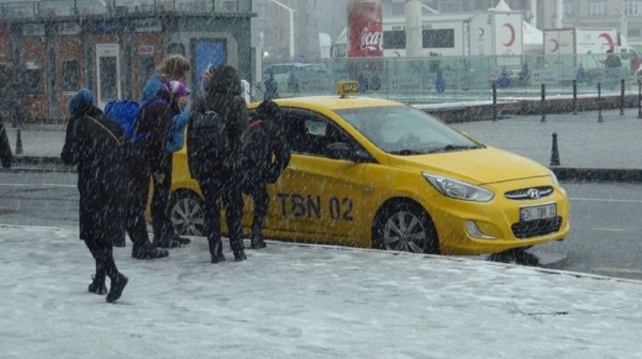Bugün Taksim Meydanı'nda çekilen görüntülerde, kar yağışı ve soğuk havada taksi taksi dolaşan vatandaşlar taksimetre açmayıp yüksek ücret isteyen sürücüler nedeniyle taksilere binemedi.