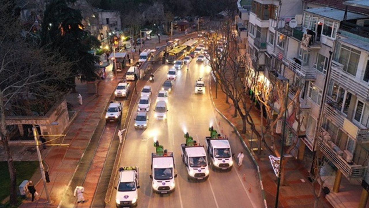 Bursa’nın yaya ve araç trafiğinin en yoğun olduğu caddelerden biri olan Tarihi Çarşı ve Hanlar Bölgesi ile Ulu Cami’yi çevreleyen Atatürk Caddesi’nde çalışmaların kısa zamanda tamamlanması için adeta çıkarma yapıldı. Çatalfırın’da başlayıp, cadde boyu devam eden çalışmaya 10 araç, 18 ilaçlama ekipmanı ve 32 personel katıldı. Caddeye yan yana dizilen 3 araç ile trafiğin işlediği yol dezenfekte edilirken, diğer ekipler de yaya kaldırımları, otobüs durakları, korkuluklar ve alt geçitleri dezenfekte etti.