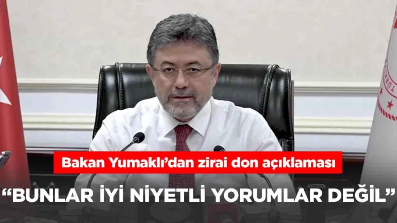 Tarım ve Orman Bakanı İbrahim Yumaklı, olumsuz hava koşulları sonucu bazı bölgelerde yaşanan zirai don olayı ile ilgili bütün ekiplerin sahada gerekli çalışmaları yürüttüğünü belirterek, "Başta hububat, baklagiller ve yağlı tohumlar olmak üzere stratejik öneme sahip tarım ürünlerinde, yurt içi gıda arzını olumsuz yönde etkileyecek bir risk bulunmuyor" dedi.