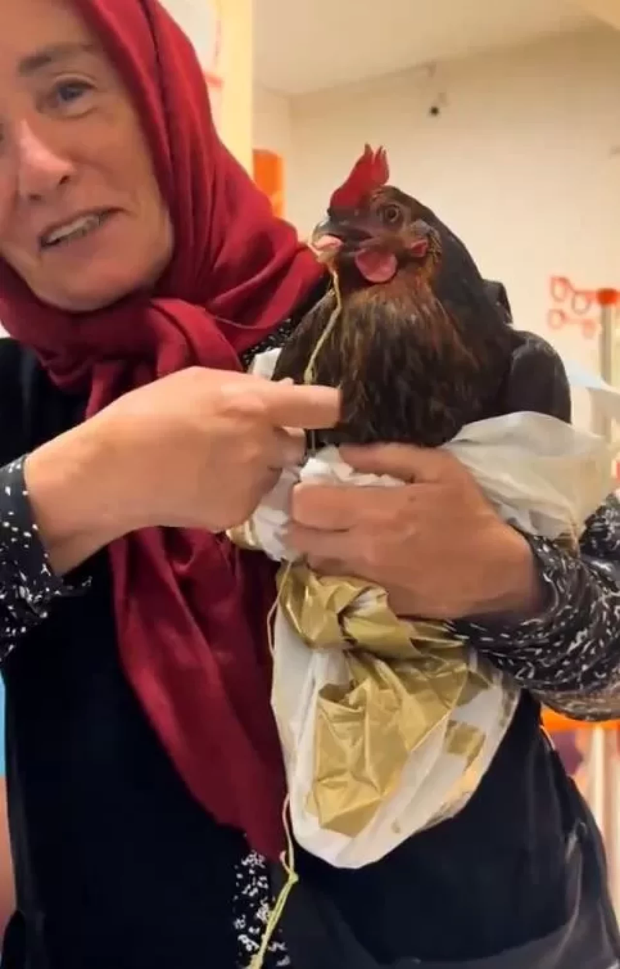 Çamoluk ilçesinde tarım ve hayvancılıkla uğraşan ismi öğrenilemeyen kadın, boğazına ucunda ip takılı halde iğne kaçan tavuğunu kucağına alıp Çamoluk Devlet Hastanesi’ne götürü. Kadın, sağlık görevlilerinden tavuğun röntgeninin çekilmesini istedi. Talep karşısına şaşıran görevliler, kadını veterinere yönlendirildi. Kadının röntgen talebinde bulunduğu anlar, çevredekiler tarafından cep telefonuyla kayda alındı.