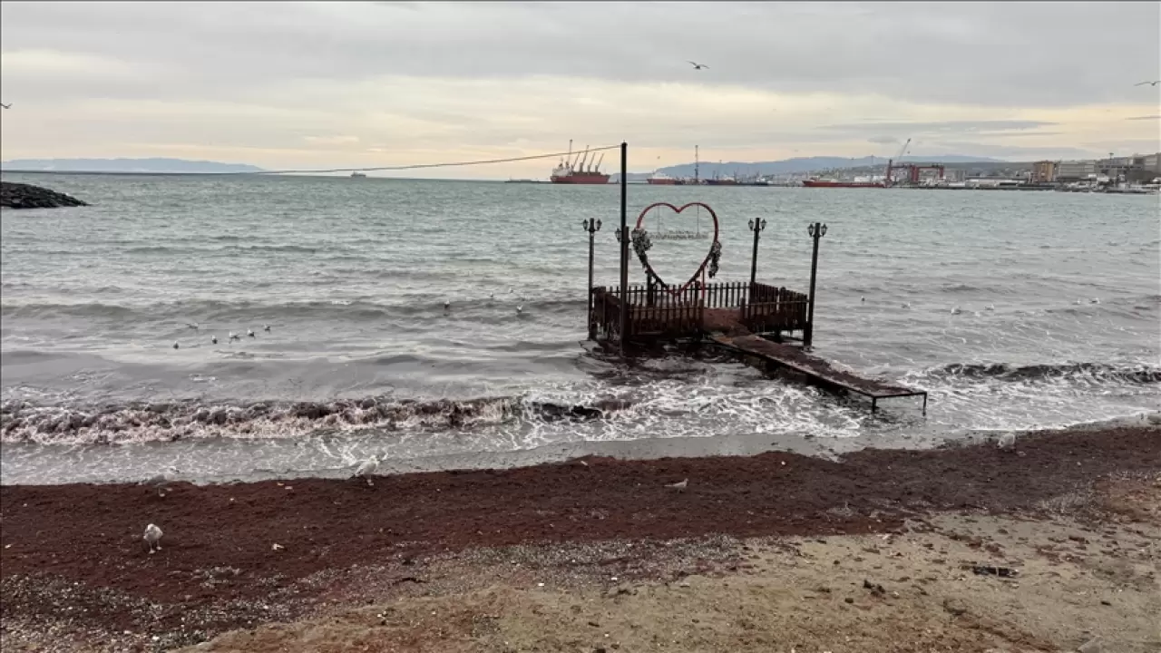Tekirdağ'da kuvvetli rüzgar nedeniyle sahilin bir kısmı kırmızı yosunla kaplandı.