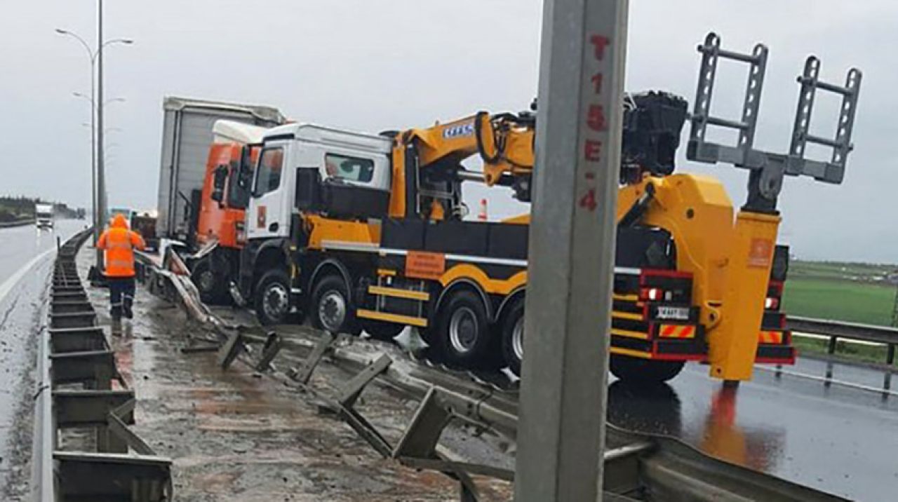 TEM Otoyolu'ndan İstanbul istikametine ilerleyen yabancı plakalı tır, Silivri Gişeleri mevkisinde sürücüsünün direksiyon hakimiyetini kaybetmesi sonucu bariyerlere çarptı. Savrulan tır, ters yöne dönerek durdu.
