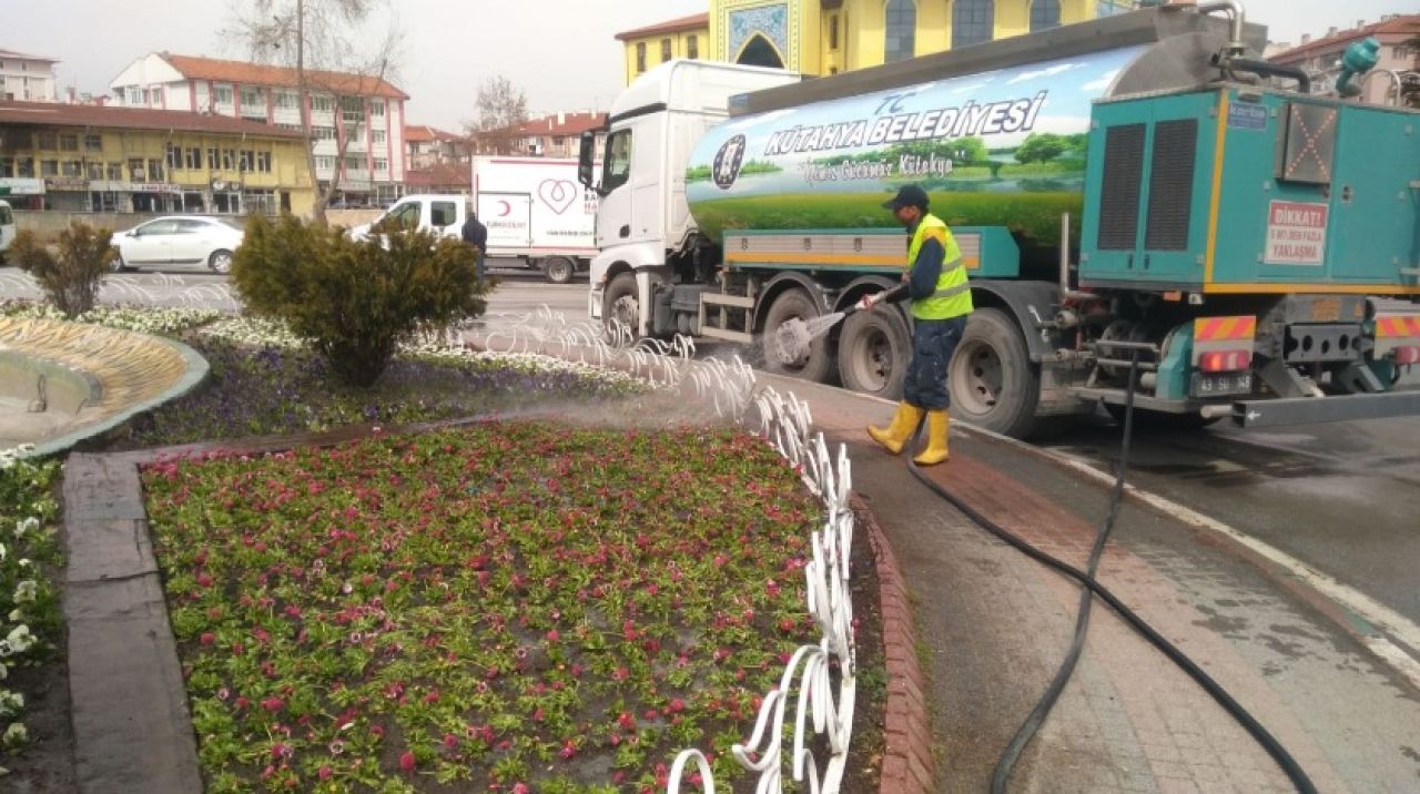 Zafer Meydanında yer alan Vazo’nun bakımını yapan ve çevresindeki çiçekleri tankerle sulayan Kütahya Belediyesi Park ve Bahçeler Müdürlüğü ekipleri, parklarda ise dezenfekte çalışmalarını kesintisiz sürdürüyor.