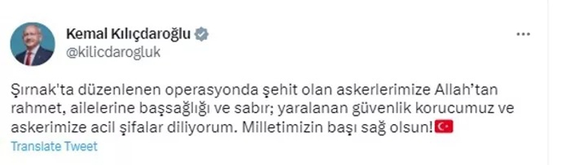 7'li koalisyonun cumhurbaşkanı adayı Kemal Kılıçdaroğlu, Şırnak'ta şehit olan 2 asker için başsağlığı mesajı yayımladı. Kılıçdaroğlu, yayımladığı başsağlığı mesajında, dünyanın en kanlı terör örgütünün adını yine söylemedi.