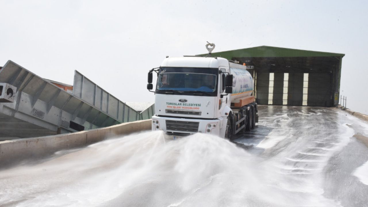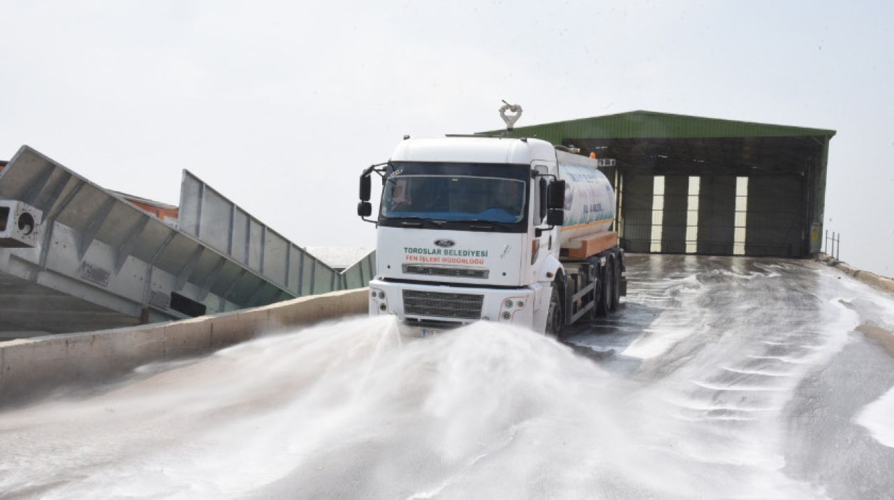 Tedbirleri en üst seviyede tutan belediye, ilçede bulunan Katı Atık Aktarma İstasyonu'nu dezenfektan aracı ile yıkayarak hijyenik hale getirdi.