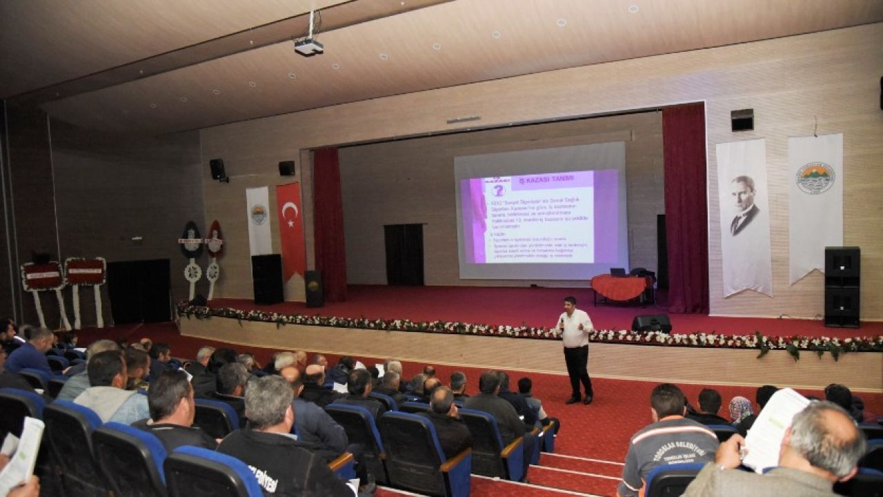 Yunus Emre Kültür Merkezi'nde, İş Sağlığı ve Güvenliği Uzmanı Uğur Soncul tarafından gerçekleştirilen sunumda; işçi ve işverenin yasal hak ve sorumlulukları, iş kazalarının ve meslek hastalıklarının önlenmesi, iş güvenliği kuralları ve acil durumlarda yapılması gerekenler anlatıldı.