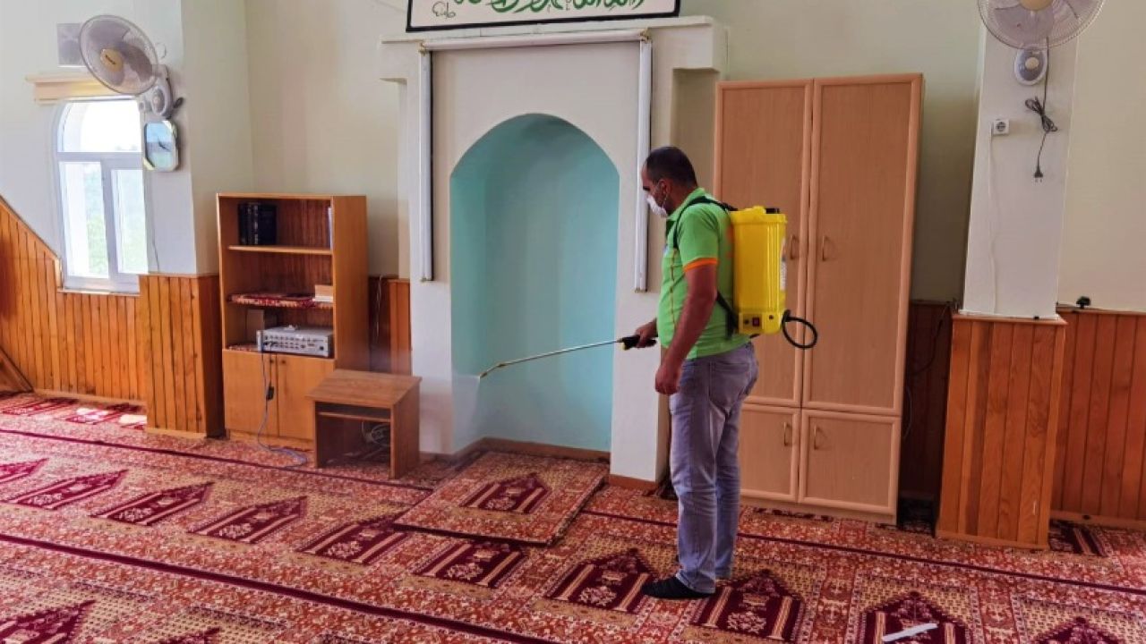 İbadethanelerdeki halılar, halı yıkama makinesiyle yerinde yıkanarak hijyenik hale getirilirken, Covid-19'a karşı avlu, tuvalet, kapı kolları ve ayakkabılık gibi temasın olabileceği tüm yüzeyler dezenfekte edildi.