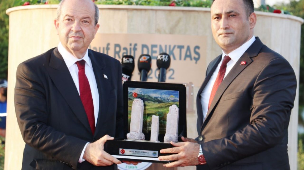 Konuşmaların ardından Toroslar Belediye Başkanı Atsız Afşın Yılmaz, Kuzey Kıbrıs Türk Cumhuriyeti Cumhurbaşkanı Ersin Tatar'a Orhun Yazıtları'nın minyatür örneğini takdim etti.