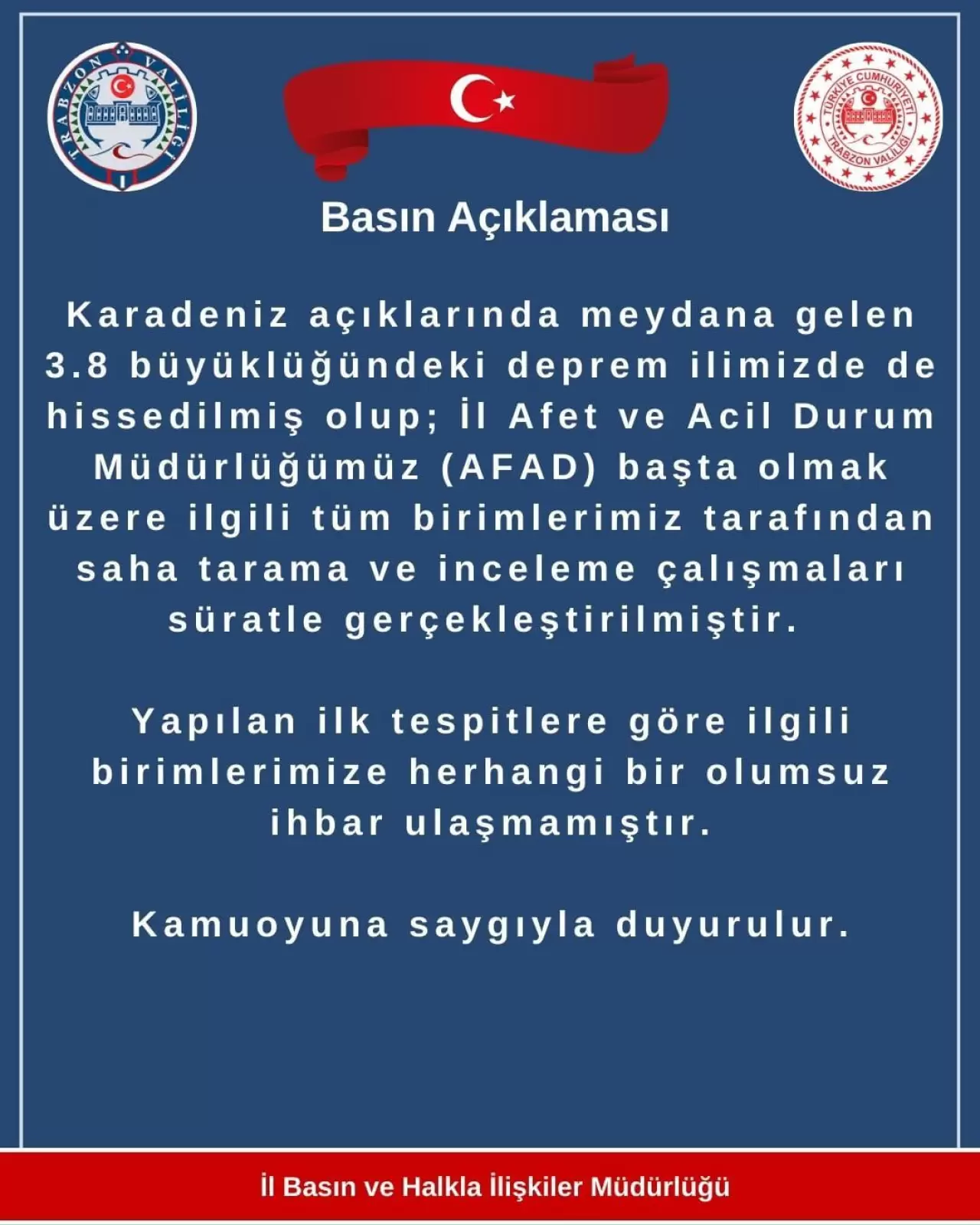 "Karadeniz açıklarında meydana gelen 3.8 büyüklüğündeki deprem ilimizde de hissedilmiş olup; İl Afet ve Acil Durum Müdürlüğümüz (AFAD) başta olmak üzere ilgili tüm birimlerimiz tarafından saha tarama ve inceleme çalışmaları süratle gerçekleştirilmiştir. Yapılan ilk tespitlere göre ilgili birimlerimize herhangi bir olumsuz ihbar ulaşmamıştır."