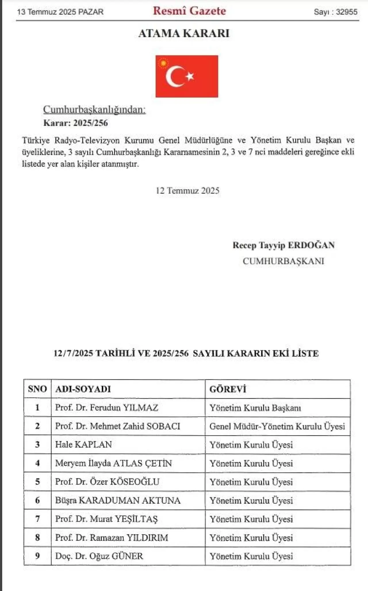 Cumhurbaşkanı Recep Tayyip Erdoğan'ın imzasıyla yayımlanan karara göre, TRT Yönetim Kurulu Başkanlığı'na Prof. Dr. Ferudun Yılmaz, TRT Genel Müdürlüğü'ne ise yeniden Prof. Dr. Mehmet Zahid Sobacı atandı.