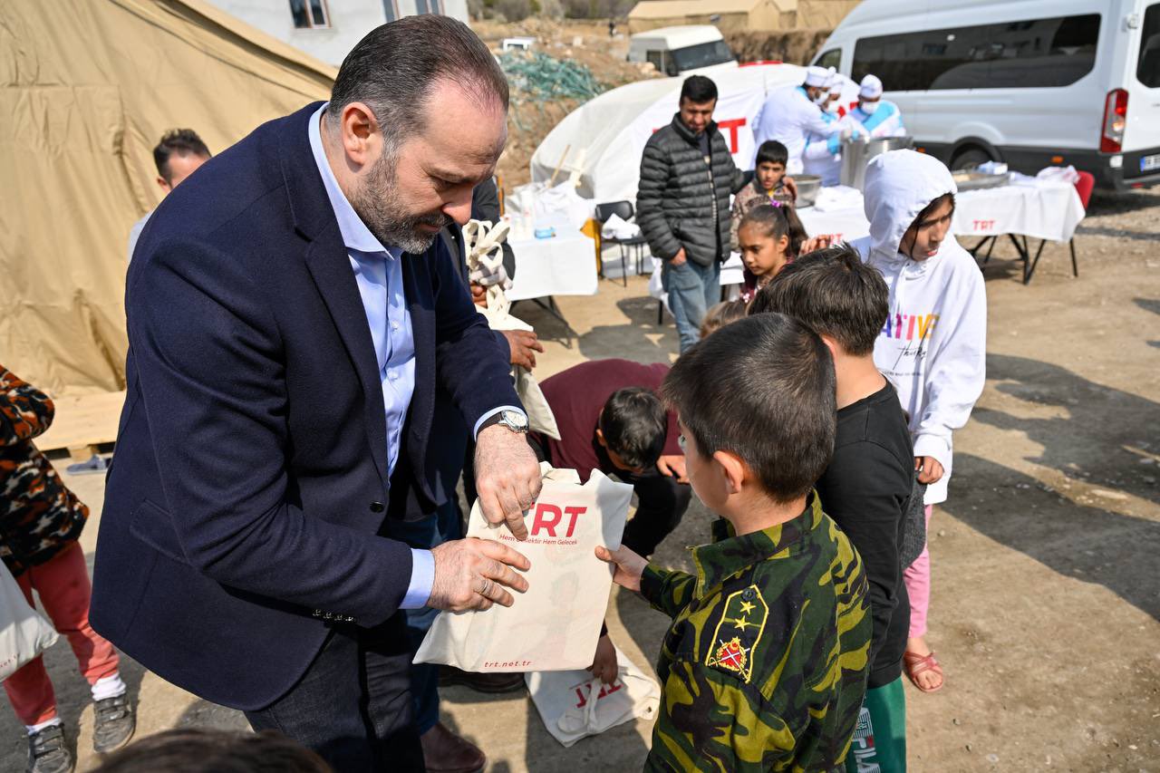 Kahramanmaraş’taki ziyaretine asrın felaketinin ilk gününden itibaren bölgede görev yapan mesai arkadaşlarıyla bir araya gelerek başlayan TRT Genel Müdürü Mehmet Zahid Sobacı, depremzedelere yemek ikramı yapılan TRT aşevlerini de ziyaret etti.