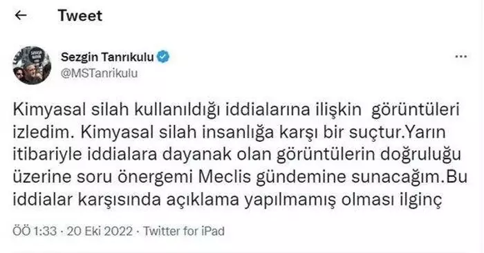 Tanrıkulu, "Türk Silahlı Kuvvetleri'nin yaptığı her şey eleştiriden azade değil, bizler milletvekiliyiz. Bunları sorgularız. TSK üzerinden bu tür şaibelerin kalkması amacıyla bunu sorarız" dedi.