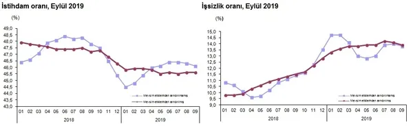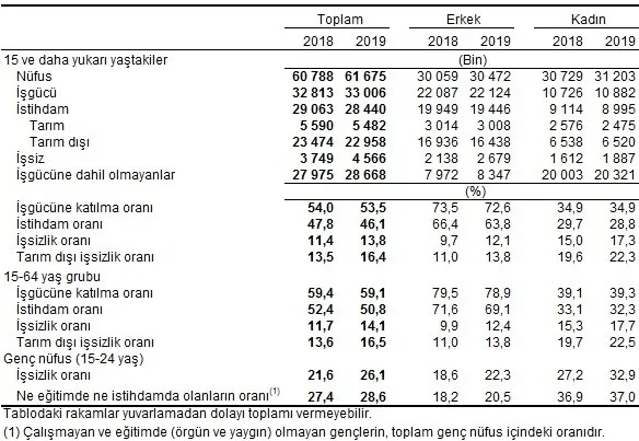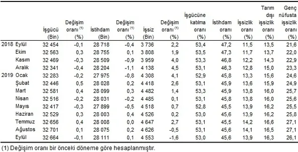 Türkiye genelinde 15 ve daha yukarı yaştakilerde işsiz sayısı 2019 yılı Eylül döneminde geçen yılın aynı dönemine göre 817 bin kişi artarak 4 milyon 566 bin kişi oldu. İşsizlik oranı 2,4 puanlık artış ile %13,8 seviyesinde gerçekleşti. Aynı dönemde; tarım dışı işsizlik oranı 2,9 puanlık artış ile %16,4 olarak tahmin edildi. Genç nüfusta (15-24 yaş) işsizlik oranı 4,5 puanlık artış ile %26,1 olurken,15-64 yaş grubunda bu oran 2,4 puanlık artış ile %14,1 olarak gerçekleşti. İşsizlik geçtiğimiz aya göre ise yüzde 0,2 oranında gerileyerek yüzde 13,8 seviyesine indi.