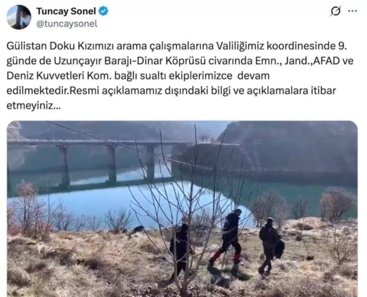 Videoya Sonel'in, "Gülistan Doku kızımızı arama çalışmalarına Valiliğimiz koordinesinde 9. günde de Uzunçayır Barajı-Dinar Köprüsü civarında Emn., Jand.,AFAD ve Deniz Kuvvetleri Kom. bağlı su altı ekiplerimizce devam edilmektedir. Resmi açıklamamız dışındaki bilgi ve açıklamalara itibar etmeyiniz..." notunu düştüğü görüldü.