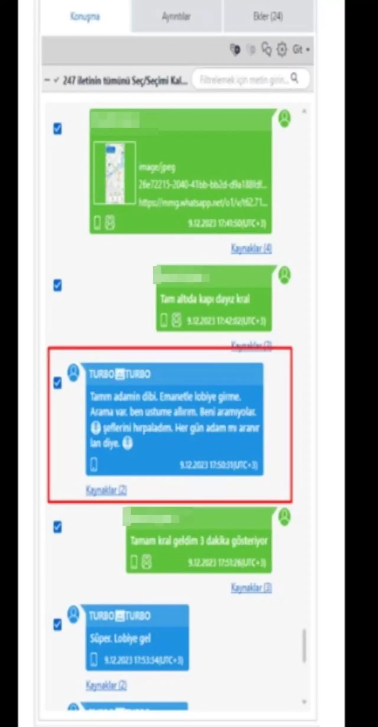 Savcılık tarafından incelenen dijital materyallerde Turabi Çamkıran'ın “TURBO TURBO” adıyla kayıtlı olduğu belirlendi. İddianamede yer alan mesajlaşmalarda Çamkıran’ın sanık M.Ş.'ye, “Benim kızın emanetini unutma. Ayın 15’i giderken emaneti sana bırakacağız ama sende dursun hep” dediği görüldü. M.Ş. ise buna “Emanet kolay” diyerek yanıt verdi. Ayrıca Çamkıran’ın Türkiye’ye dönüş yaptığı 3 Aralık 2023’te M.Ş.'ye yeni bir numaradan ulaştığı da belgelerde yer aldı.