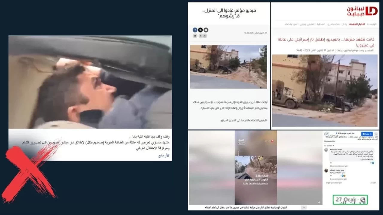 İddiaya konu görüntülerin Suriye'de değil, Lübnan'ın güneyindeki Aytarun beldesinde kaydedildiği belirtilen açıklamada, DMM, "Görüntüler, evini inceleyen bir aileye, İsrail askerleri tarafından ateş açıldığı anları göstermektedir" değerlendirmesinde bulundu.