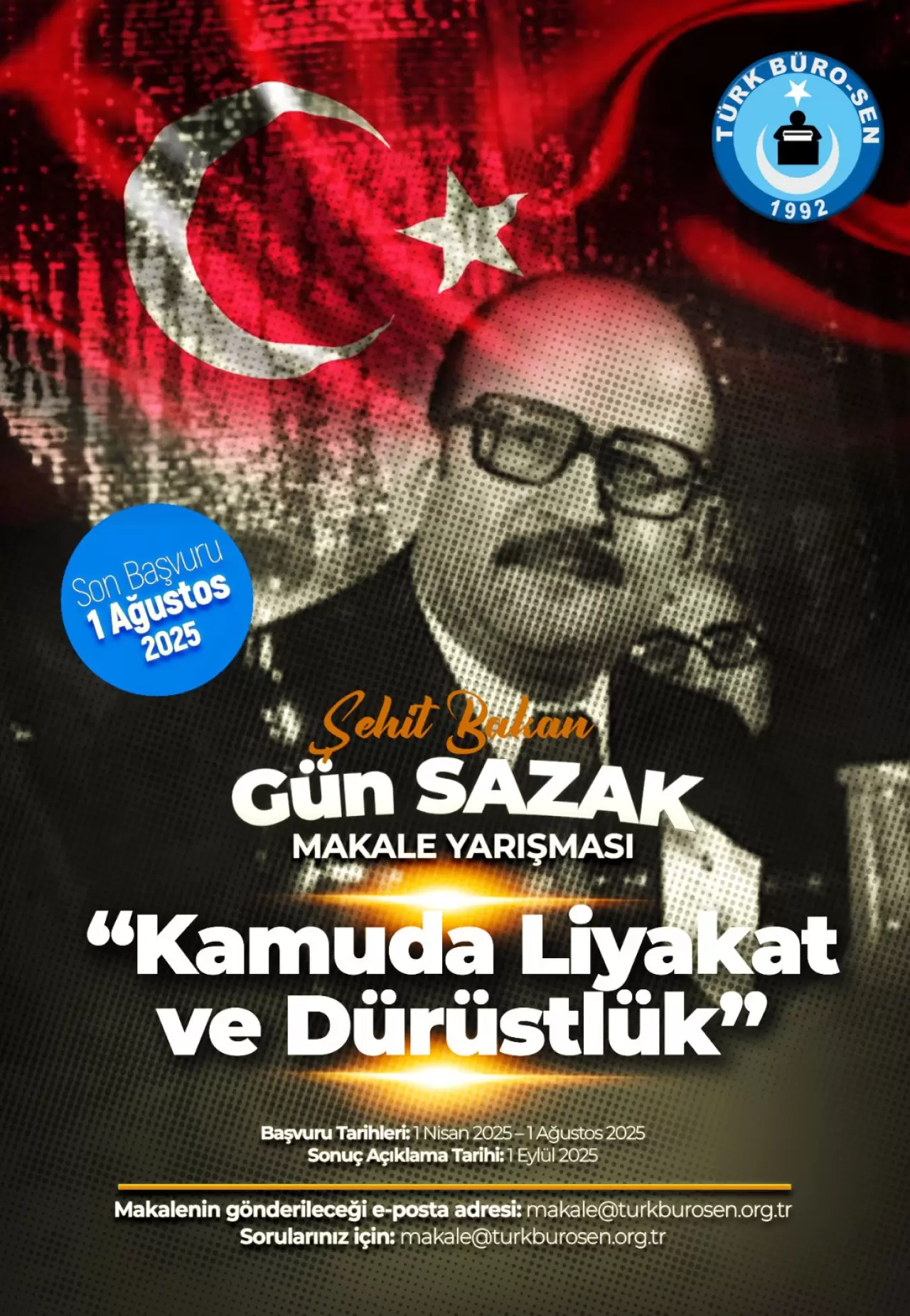 Türk Büro Sen, kamu yönetiminde liyakat ve dürüstlük ilkesine dikkat çekmek ve Şehit Gümrük ve Tekel Bakanı Gün Sazak'ı anmak amacıyla bir makale yarışması düzenliyor. Yarışma, 1 Nisan 2025 ile 1 Ağustos 2025 tarihleri arasında başvurulara açık olacak.