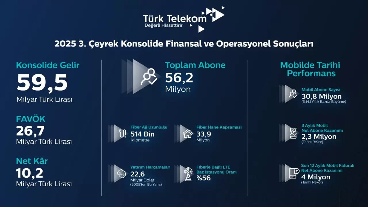 Türk Telekom, 2025’in üçüncü çeyreğinde konsolide gelirlerini geçen yılın aynı dönemine göre yüzde 10,7 artışla 59,5 milyar TL'ye yükseltti. Sabit internet ve mobil, kurumsal data ile birlikte büyümeye bir kez daha öncülük ederken Türk Telekom’un üçüncü çeyrekteki FAVÖK’ü yüzde 21,6’lık artışla 26,7 milyar TL’ye ulaştı. Üçüncü çeyrekteki net karı 10,2 milyar TL olan Türk Telekom, bu çeyrekte 21,7 milyar TL’lik yatırım gerçekleştirdi.