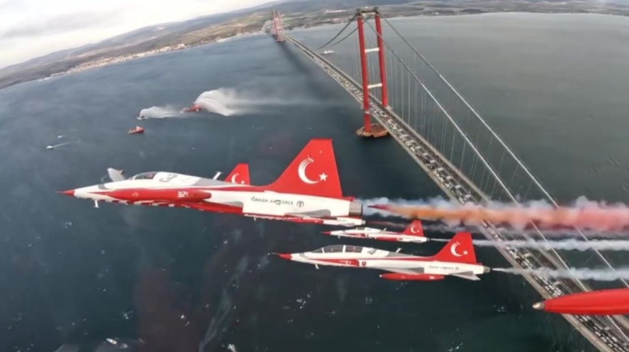 Türk Hava Kuvvetlerinin akrobasi timi Türk Yıldızları, Çanakkale Boğazı'nın gerdanlığı" olarak nitelendirilen 1915 Çanakkale Köprüsü'nün açılış töreninin ardından gösteri uçuşu gerçekleştirdi.