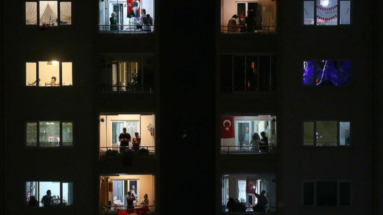 Saat 21.00'de vatandaşlar, balkonlarından ay yıldızlı bayraklar eşliğinde İstiklal Marşı'nı okuyarak bayram coşkusu yaşadı.