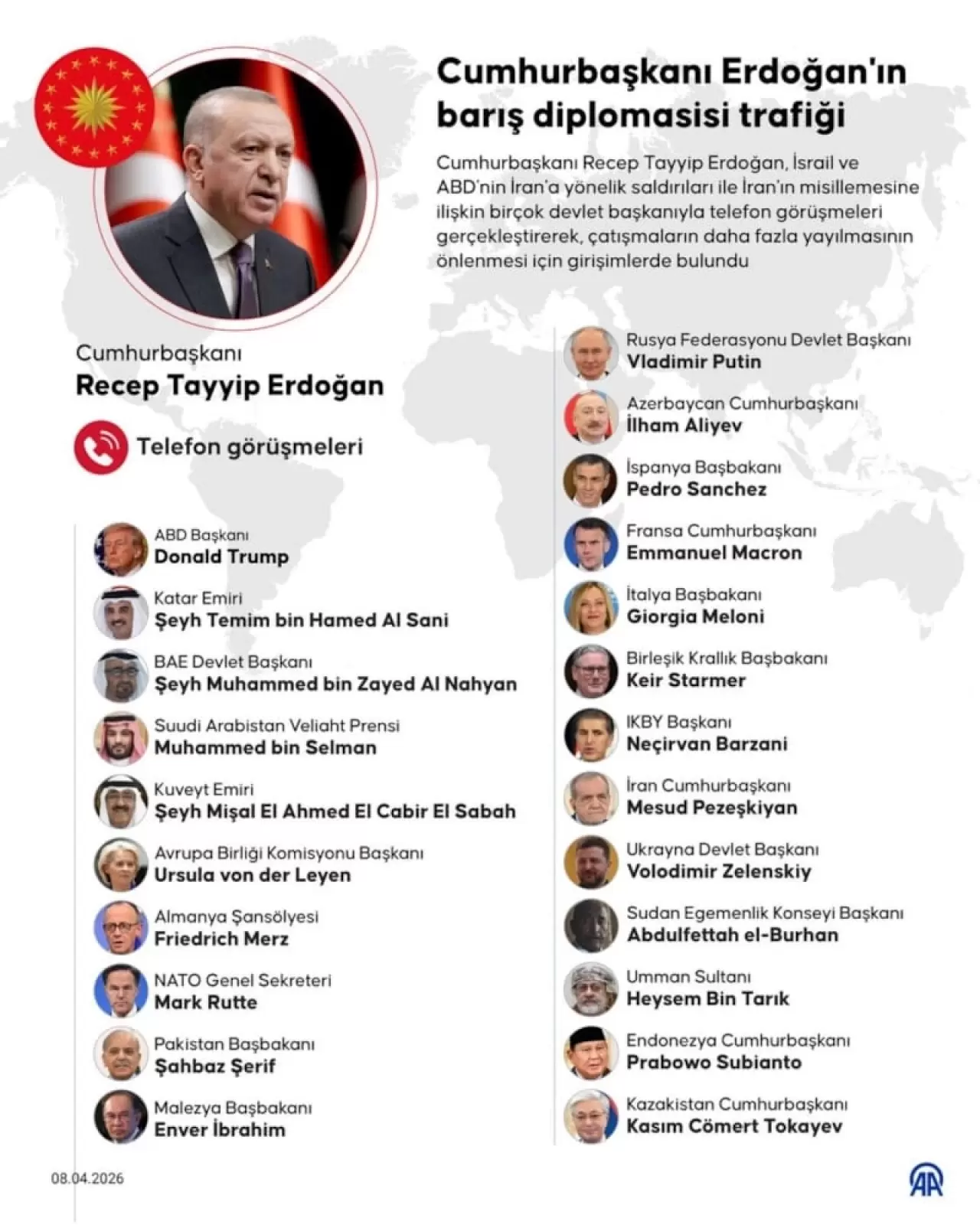 Erdoğan, bu kapsamda savaşın tarafları ABD Başkanı Donald Trump'tan İran Cumhurbaşkanı Mesud Pezeşkiyan'a, Avrupa Birliği (AB) yöneticilerinden AB ülke liderlerine, yine ateşkes çalışmalarında büyük rol oynayan Pakistan Başbakanı Şahbaz Şerif'e, onlarca liderle iletişime geçti.