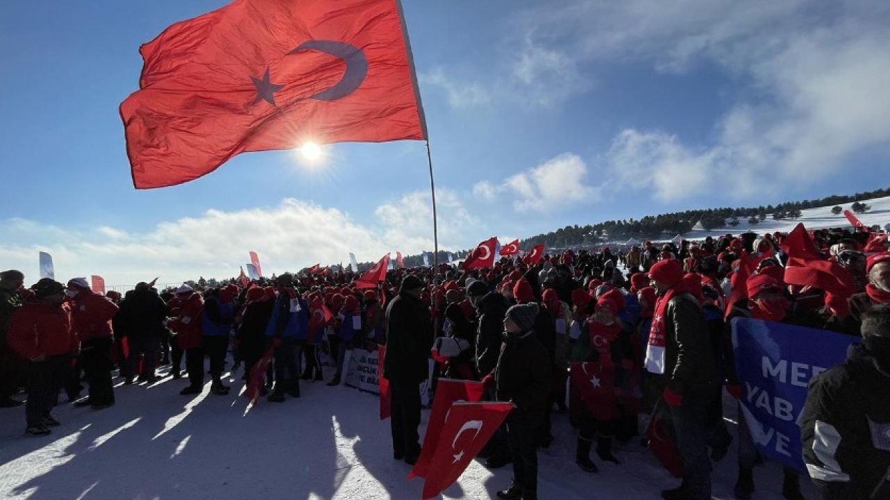 Kars merkez ve Sarıkamış ilçesinden, otobüslerle zirveye ulaşan vatandaşlar, ellerinde Türk bayraklarıyla yürüyerek toplanma alanına geldi.