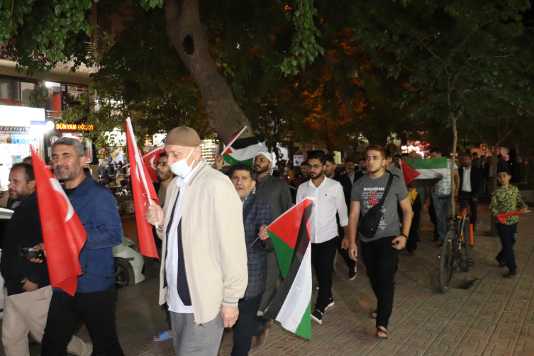 Alanı dolduran kalabalık, namazın ardından ellerindeki yazılı dövizlerle Saraçhane Parkı'na yürüdü. Türkiye ve Filistin bayrakları açan gruptakiler, abluka altındaki Gazze Şeridi'nden İsrail'e saldırı başlatan Hamas ile Filistin direnişini destekleyen sloganlar attı.