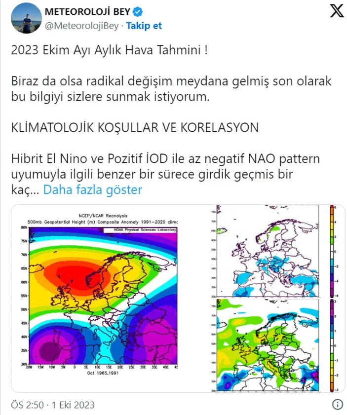 Sosyal medya üzerinden hava durumuna ilişkin bilgilendirmelerde bulunan meteoroloji uzmanı, ekim ayı için tahminlerini yayınladı. Yaptığı paylaşımda ekim ayının normalden biraz daha soğuk olacağını ifade ederek, "Doğu Karadeniz yaylaları ve Doğuda kayak merkezleri kar sezonunu açacaktır. Orta Akdeniz siklonu nadir olacağından Trakya-Ege-Batı Akdeniz normalden az yağışlı/kurak bir ay yaşayacak” dedi.