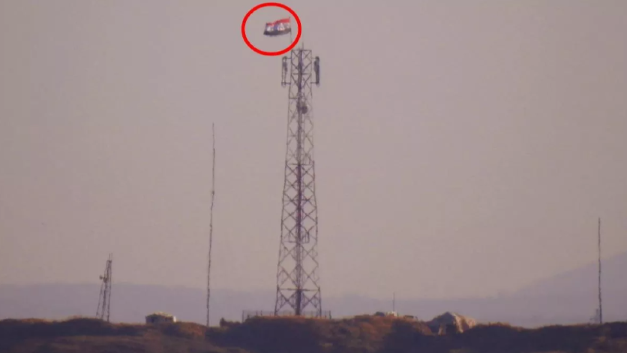 AA'nın Fırat Kalkanı bölgesindeki cephe hattından yaptığı çekimde, Tel Rıfat merkezinin tam ortasındaki büyük anten kulesinde rejim bayrağının asılı olduğu görülüyor.