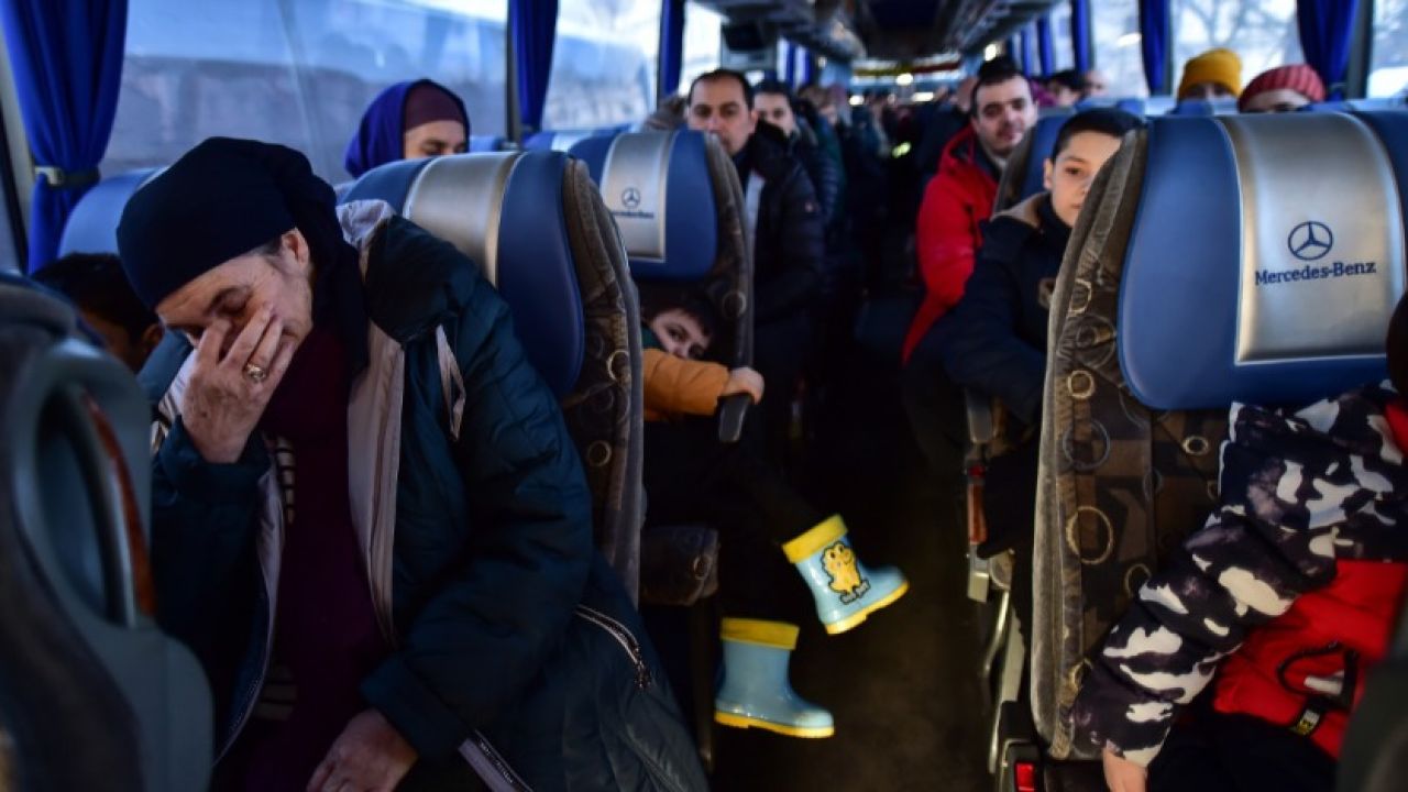 Rusya'nın saldırılarından kaçarak tahliye otobüslerine ulaşan vatandaşlar büyük mutluluk yaşıyor.