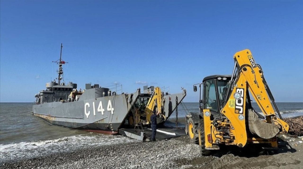 TCGÇ-144 isimli çıkarma gemisine Kastamonu'nun Abana sahilinden yüklenen 7 iş makinesi, 2 saatlik yolculuğun ardından Türkeli'de karaya çıkarıldı.