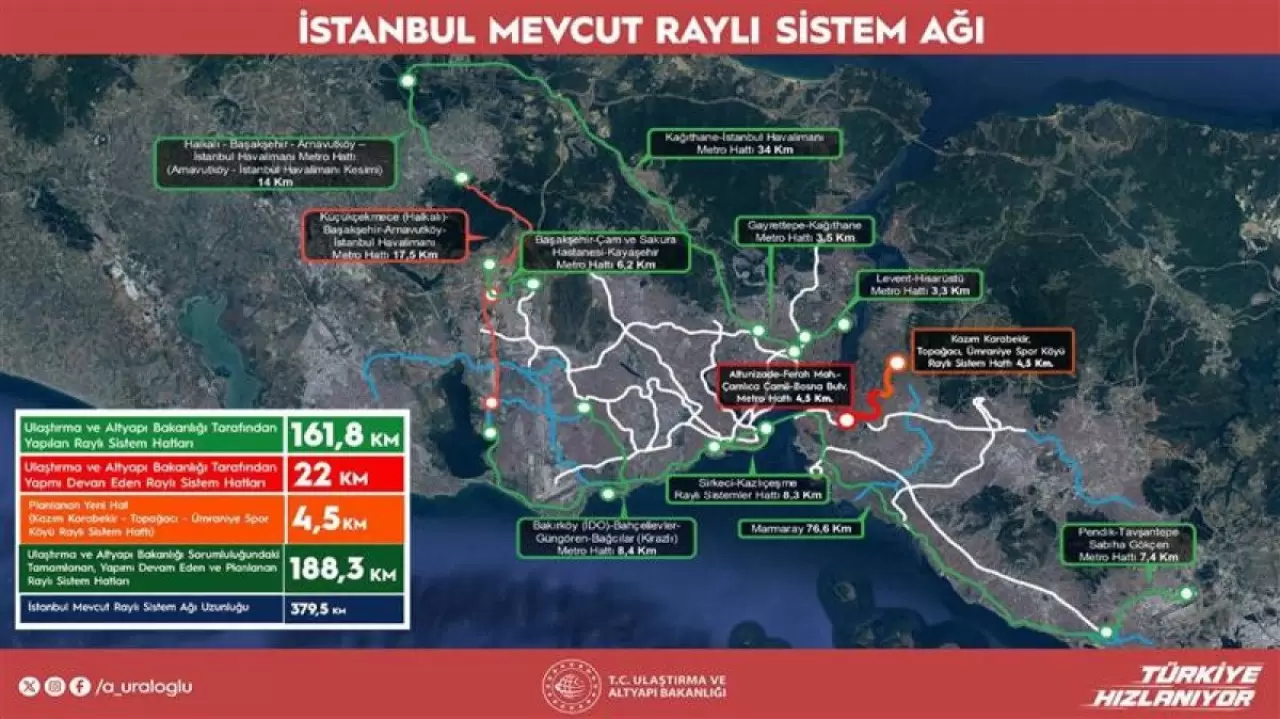 Ulaştırma ve Altyapı Bakanı Abdulkadir Uraloğlu, İstanbul'a kazandırılacak yeni hatla ilgili olarak açıklamada bulunarak, “Böylece, yapımı devam eden hat uzunluğumuz 26,5 kilometreye, İstanbul genelinde inşa ettiğimiz toplam hat uzunluğu ise 188 kilometreye ulaşacak.” dedi.