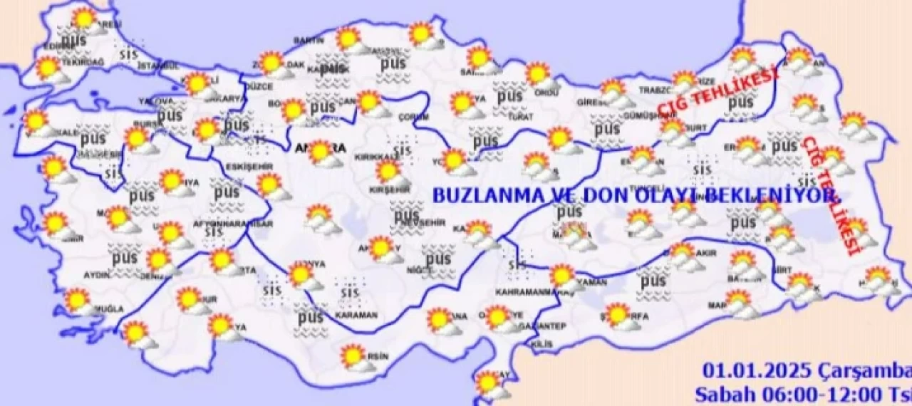Yurdun iç ve doğu kesimlerinde buzlanma ve don olayı ile birlikte pus ve sis etkili olacak. Özellikle Doğu Karadeniz’in iç kesimlerinin yüksekleri ve Doğu Anadolu’nun dik yamaçlarında çığ riski bulunuyor. Vatandaşların dikkatli olması öneriliyor.