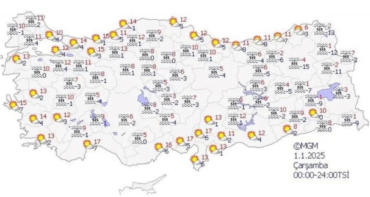 Meteoroloji Genel Müdürlüğü, 1 Ocak 2025 için hava durumu tahminlerini yayınladı. Ülke genelinde yağış beklenmezken, iç ve doğu kesimlerde dikkat edilmesi gereken durumlar bulunuyor.