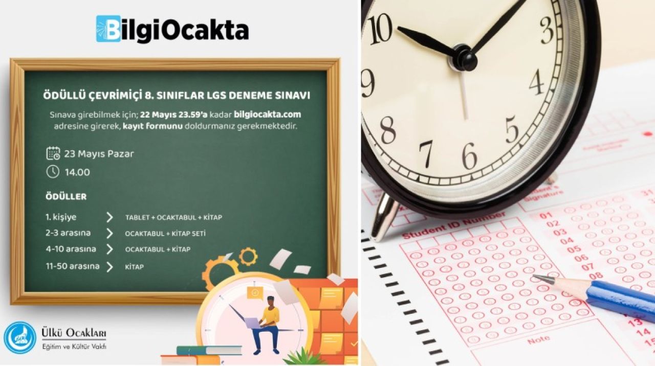 Ülkü Ocakları Eğitim ve Kültür Vakfı Genel Merkezi, 23 Mayıs Pazar günü saat 14.00'da bilgiocakta.com adresi üzerinden "Ödüllü Çevrimiçi 8. Sınıflar LGS Deneme Sınavı" yapacağını duyurdu.