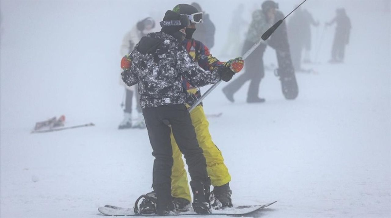 Sis ve rüzgarın etkili olduğu, kar kalınlığının 58 santimetreye ulaştığı Oteller Bölgesi'nde kayak ve snowboard yapanlar zaman zaman zorluk yaşıyor.
