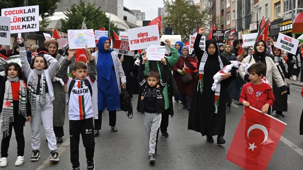 "Netanyahu 21. yüzyılın Hitleridir" yazılı pankart açıp, "Gazze'de soykırım var", "Nehirden denize Özgür Filistin", "Aksa özgür olana kadar Filistin'in yanındayız" yazılı dövizler taşıyan katılımcılar, Ümraniye 15 Temmuz Şehitler Meydanı'na kadar yürüdü.