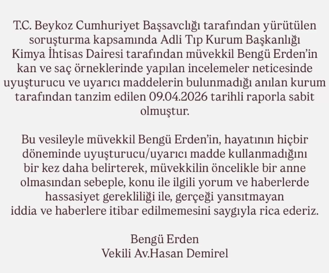 "T.C. Beykoz Cumhuriyet Başsavcılığı tarafından yürütülen soruşturma kapsamında Adli Tıp Kurum Başkanlığı Kimya İhtisas Dairesi tarafından müvekkil Bengü Erden'in kan ve saç örneklerinde yapılan incelemeler neticesinde yasaklı madde ve uyarıcı maddelerin bulunmadığı anılan kurum tarafından tanzim edilen 09.04.2026 tarihli raporla sabit olmuştur.